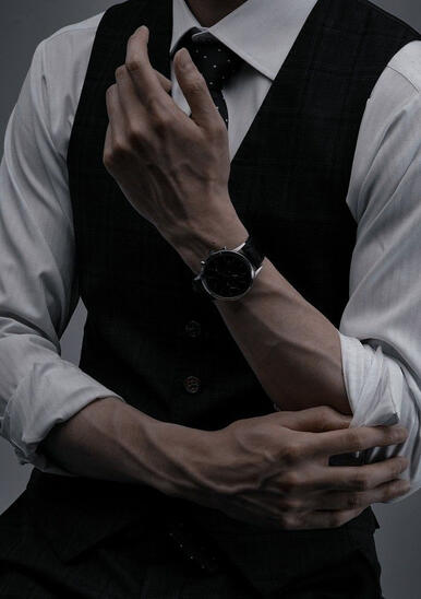 He is stated to have wide black eyes with thin double eyelids and thick eyebrows. His hair is black and slightly wavy, cut short with a 4/6 parted hairstyle. He also has a sharp nose ridge and a strong jawline.